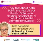 I am truly honoured to be included among the Global Top 100 Data Visionaries: These are the leaders who are vividly innovating with analytics without compromising on trust and privacy. My data team at UNSW are truly marvellous – they are always willing to come along on the innovation journey, try new things, and learn new skills. A huge thank-you to them, because without them none of my ideas would become real. Teamwork makes amazing things possible.