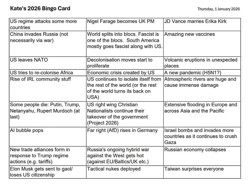 As is my tradition I do my annual bingo card at the start of the new year to deal with my existential dread. Herewith my 2026 bingo card. I’ll be doing a wrap up on my 2025 BingoCard shortly.